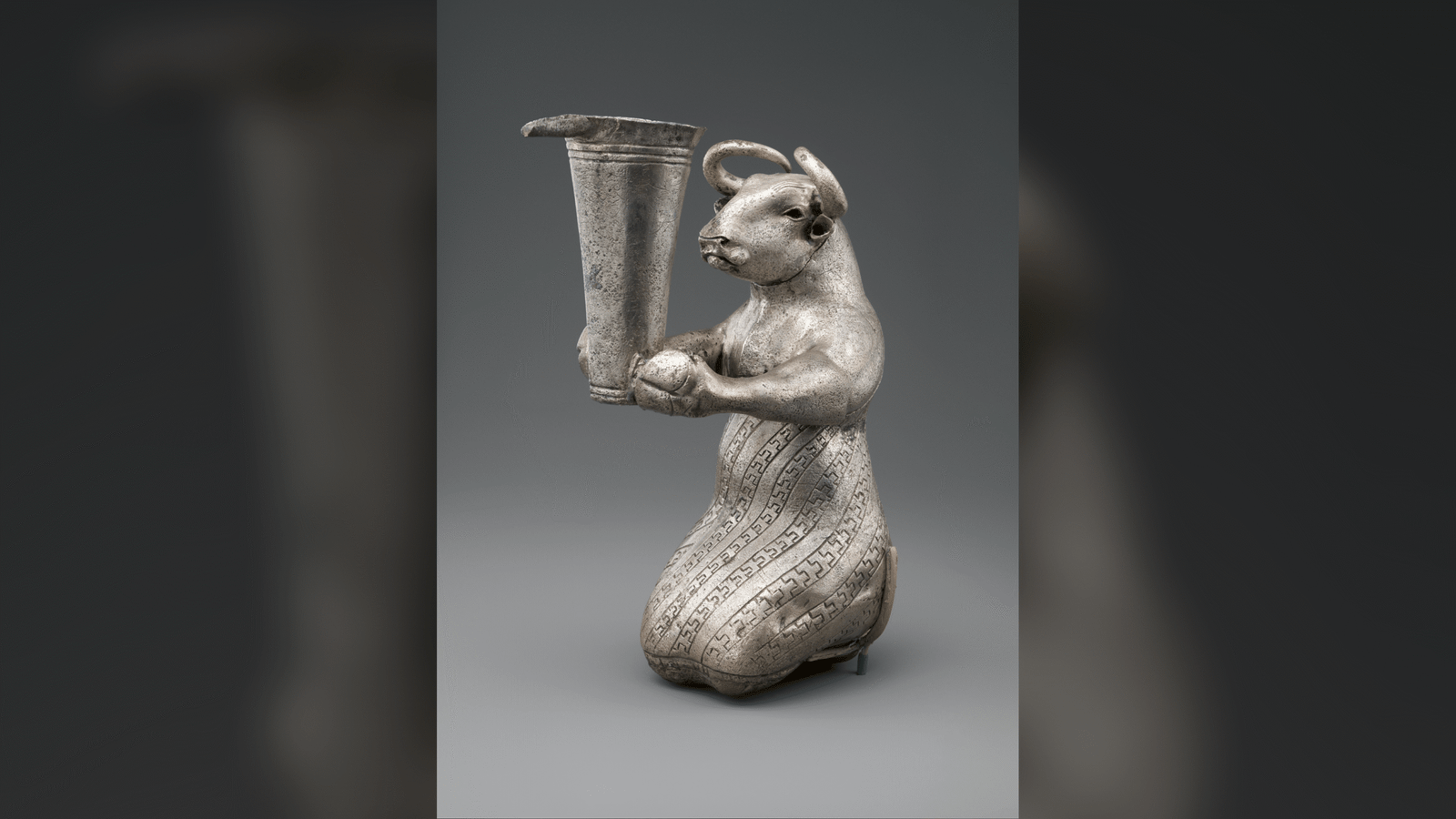 This 5,000-year-old silver figurine depicts a bull kneeling in a human-like pose and holding a spouted vessel. It was made in southern Mesopotamia by someone from the Proto-Elamite culture, the oldest civilization in Iran, and was likely used in a ritual or ceremony.